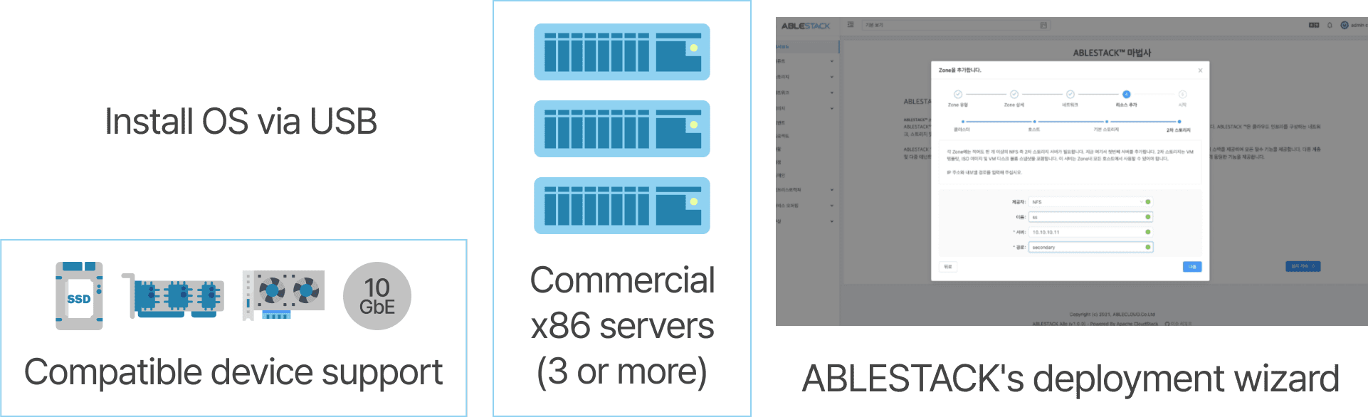 Quick and simple installation of all HCI components using ABLESTACK's deployment wizard.